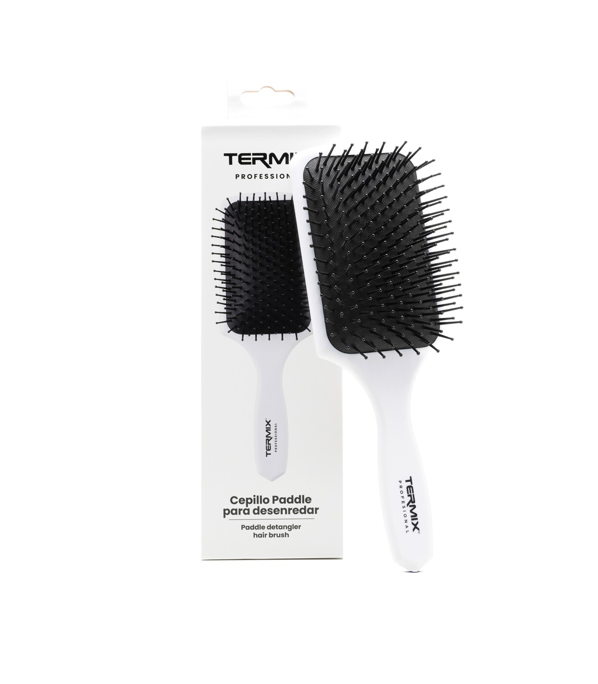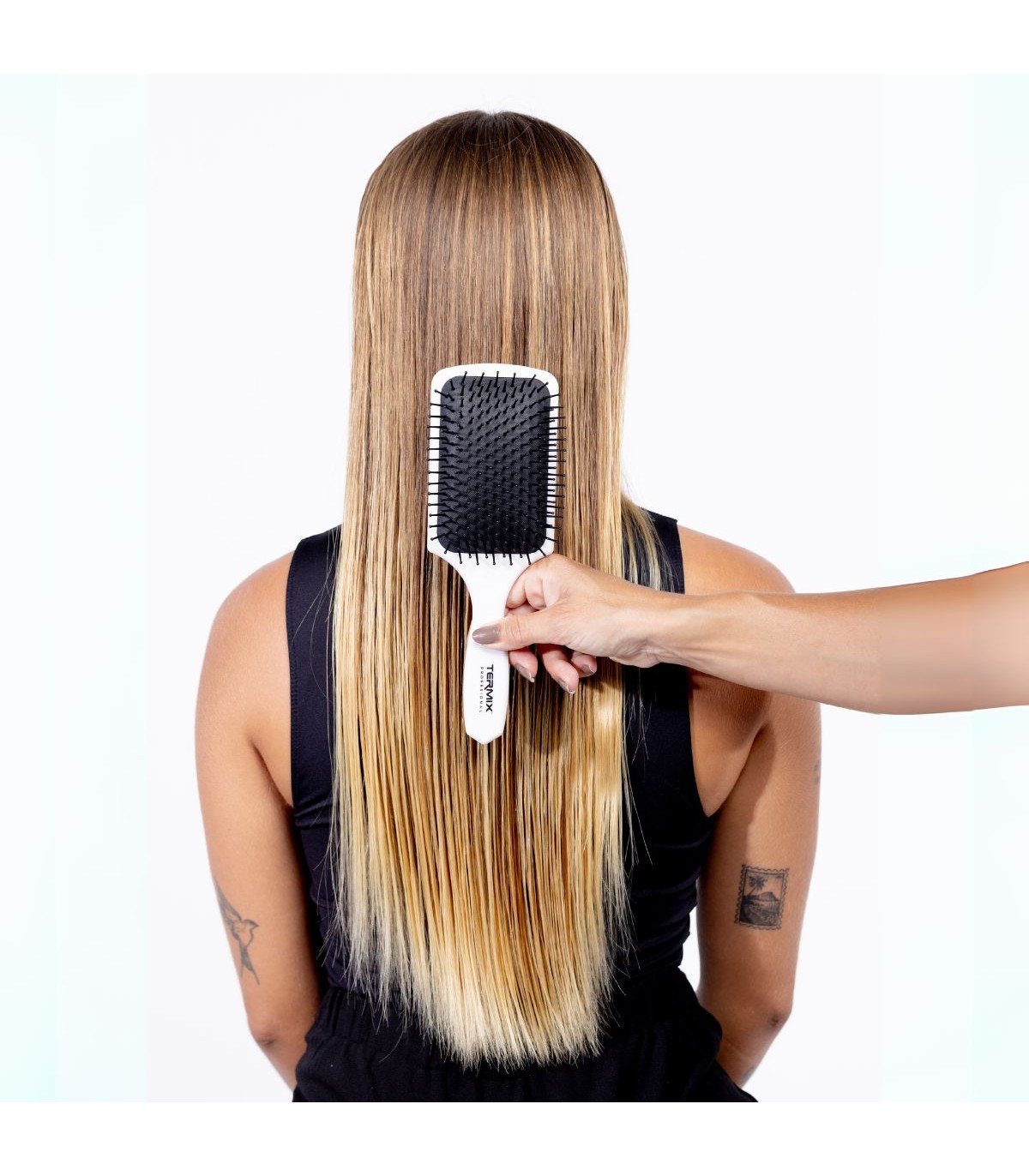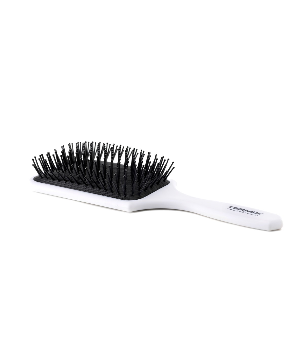 El Cepillo Paddle White de Termix Professional está diseñado para desenredar de manera rápida y sin tirones, cuidando el cabello en cada pasada. Su almohadilla neumática flexible y sus fibras gruesas con puntas redondeadas permiten un cepillado suave que no solo evita la rotura, sino que también masajea el cuero cabelludo, estimulando la circulación y favoreciendo un cabello más sano.